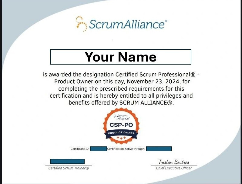To receive the Certified Scrum Professional – Product Owner (CSP-PO) certification, you need to have an A-CSPO (Advanced Certified Scrum Product Owner) certification with the Scrum Alliance, have 2 years of work experience as a Product Owner in the last 5 years, and satisfactorily complete an accredited CSP-PO training program. There is not formal exam but you must finish pre--post work as guided by trainer during the training.